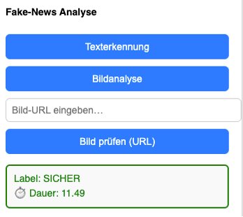 Zur Analyse kommt die multimodale KI LLaVA (Large Language and Vision Assistant) zum Einsatz, die sowohl sprachliche als auch visuelle Informationen verarbeitet. Beim Start des Plugins kann der Nutzer auswählen, ob der Text der aktuellen Seite oder ein Bild überprüft werden soll. Der jeweilige Inhalt wird dann an das lokale Flask-Backend übergeben, das die Inferenz durchführt und eine Bewertung zurückgibt.