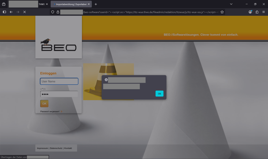 In der Login-Komponente von BEO GmbH — BEO Atlas Einfuhr – Ausfuhr 3.0 haben wir eine reflected Cross-Site Scripting (XSS)-Schwachstelle gefunden. Durch nicht ausreichend escaped/validierte Parameter (userid, password) kann ein Angreifer eine präparierte URL erzeugen, durch deren Öffnung im Browser eines Opfers beliebiges JavaScript ausgeführt wird.