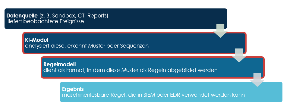 Ziel ist es, zeitliche und kausale Abhängigkeiten zwischen sicherheitsrelevanten Ereignissen automatisiert zu erkennen und daraus formale Erkennungsregeln abzuleiten. Wie in Abbildung 1 zu sehen ist, reicht der Prozess von der Datenerfassung über die Analyse durch ein KI-Modul bis hin zur automatisierten Erstellung maschinenlesbarer Regeln. Langfristig soll so ein KI-gestütztes Regelmodell entstehen, das eigenständig Detektionsregeln in Formate wie Sigma, YARA oder EQL überführt und bestehende SIEM- und EDR-Systeme adaptiv erweitert.